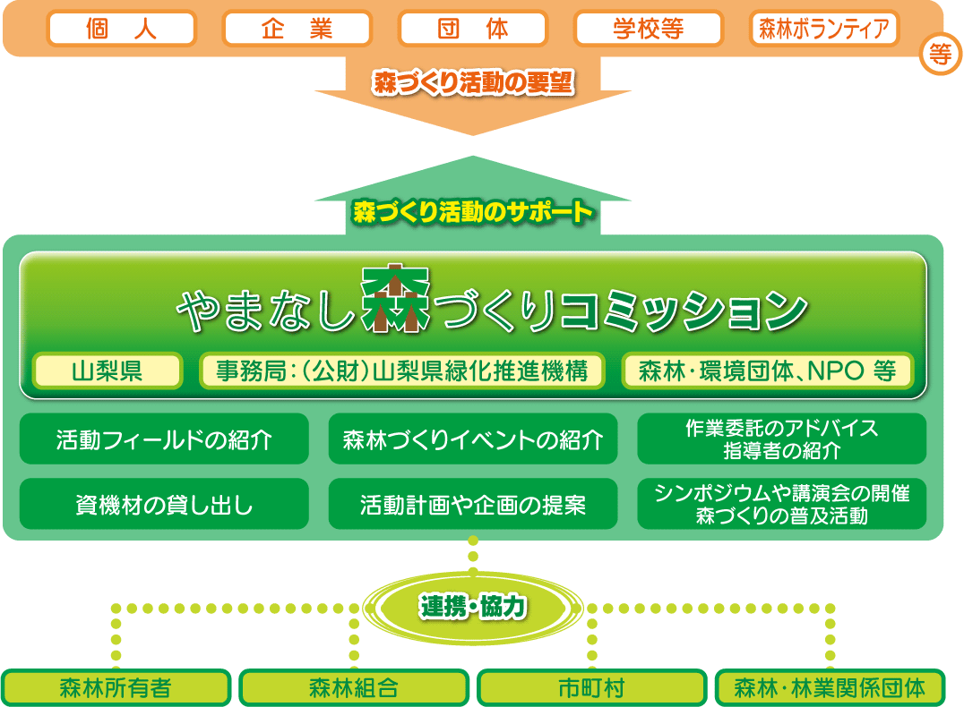 こうした取り組みを進めていくため、森づくり活動の推進組織として「やまなし森づくりコミッション」を設立し、県民や流域住民をはじめ企業、団体等による森づくり活動を支援することにより、県内はもとより下流域の広大な地域に大きな恵みをもたらす豊かな森林を次の世代に伝え残していきます。